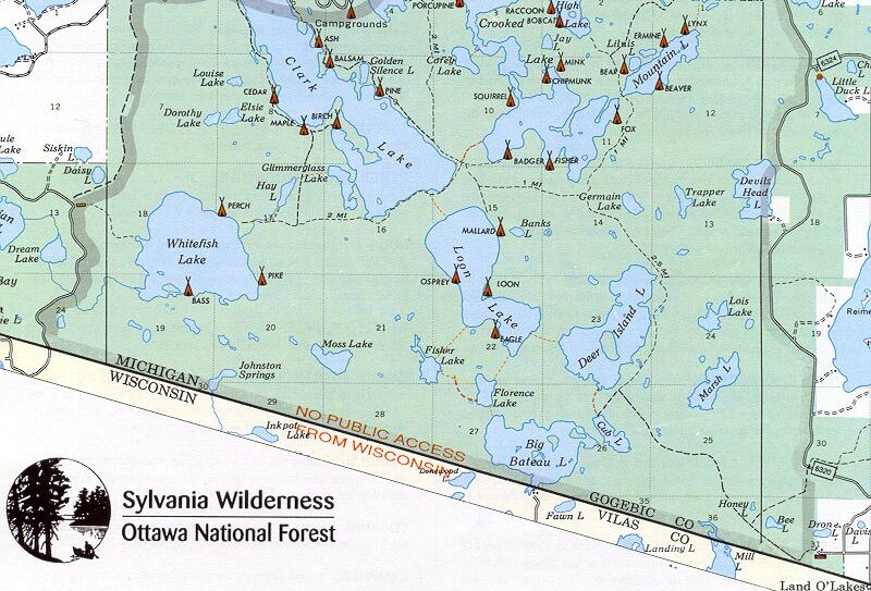 Motorized, mechanized or gas-powered vehicles, including motors, portage wheels and bicycles, are not allowed within the Wilderness portion of the park. Gas motorboats are not allowed on any of the lakes in the Sylvania Wilderness Area with one exception. A few Crooked Lake property owners and their guests are allowed to take their gas motorboats into the wilderness area on Crooked Lake. Electric motors are allowed in the Wilderness Area on Crooked Lake only. Electric motors are limited to an equivalent of 48lbs of thrust or 4hp.